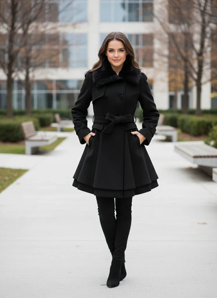 This chic trench coat features a structured silhouette with a distinctive layered hem that adds movement and shape. The double-breasted front brings a polished finish, while the belted waist offers adjustable definition for everyday styling. A soft, smooth outer texture complements the elegant flared design, making it a standout piece for cooler seasons. Ideal for pairing with knitwear, tailored pants, or dress-focused looks.