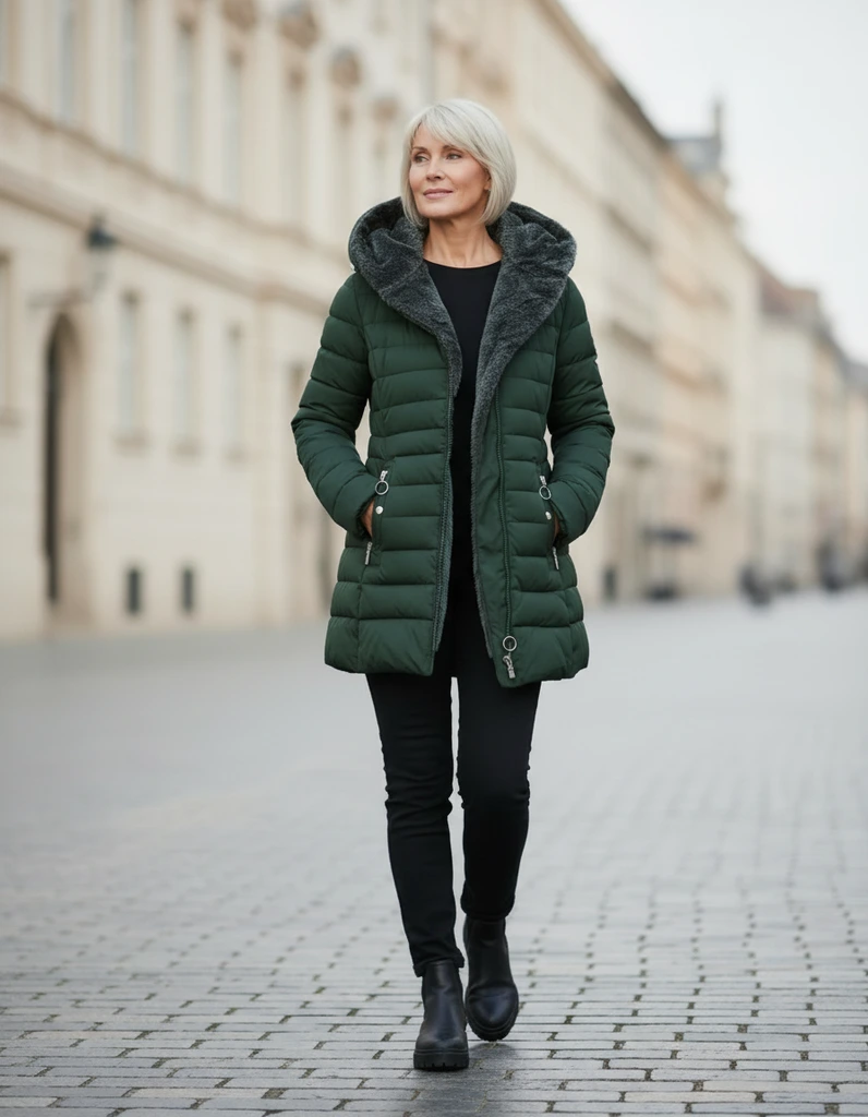 This women’s hooded quilted coat is designed for dependable warmth with a clean, everyday silhouette. The evenly quilted exterior creates a structured look, while the softly lined interior adds comfort without bulk. A full zip front and attached hood provide practical coverage for colder days. Finished with a streamlined length and balanced proportions, this coat layers easily over casual outfits and works well for daily wear, travel, and outdoor routines.