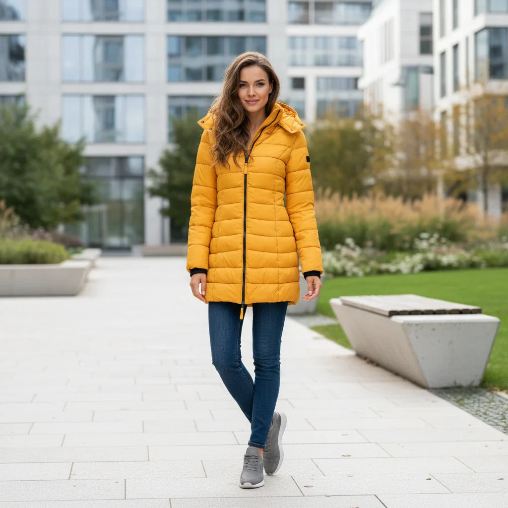 This winter puffer jacket delivers warm, lightweight insulation in a clean, streamlined silhouette. Its long length offers added coverage, while the quilted paneling provides structure without bulk. The hood and full zip closure make it practical for cold, windy days, and the fitted sleeves help keep warmth in. Designed for easy winter layering, it pairs effortlessly with everyday denim, knitwear, or outdoor essentials.