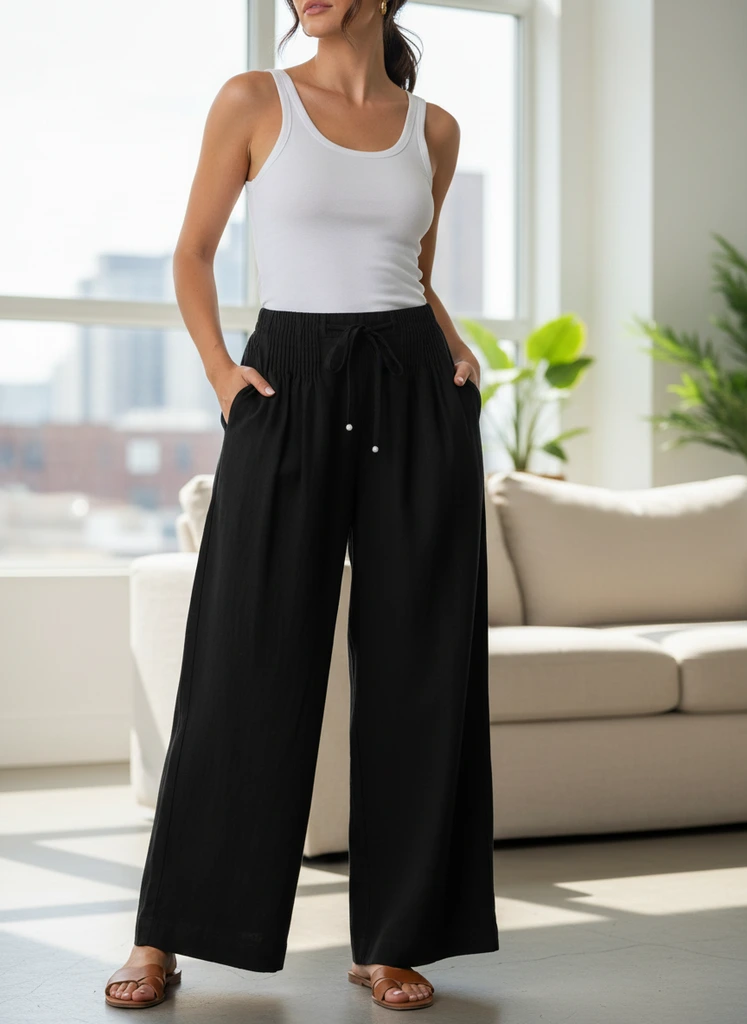 These women’s wide-leg pants are designed with a relaxed silhouette that offers ease of movement and everyday comfort. The smooth, lightly structured surface keeps the look clean and versatile, while the adjustable drawstring waist allows for a flexible, comfortable fit. Finished with a straight, flowing leg, they pair easily with casual tops or lightweight knits. Suitable for daily routines, travel, or relaxed outings, these pants balance comfort with a refined, modern shape.