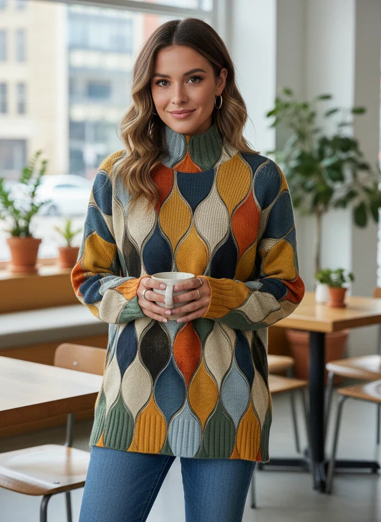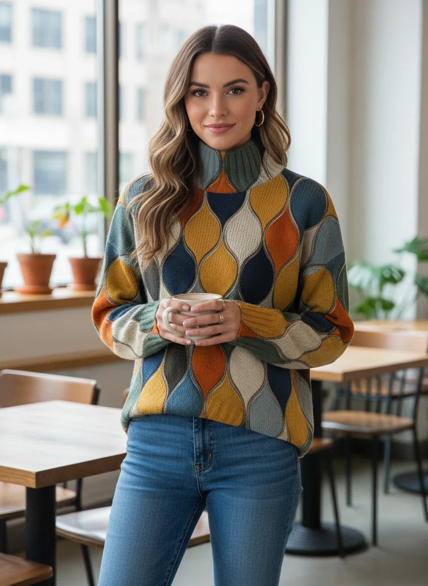 The Colorful Retro Printed Sweater adds a vibrant touch to your wardrobe with its artistic geometric pattern and modern silhouette. Designed for both comfort and individuality, it combines soft knit texture with a relaxed yet elegant fit. The high neckline creates a refined look, making it perfect for cozy weekends, stylish outings, or creative layering through every season.
