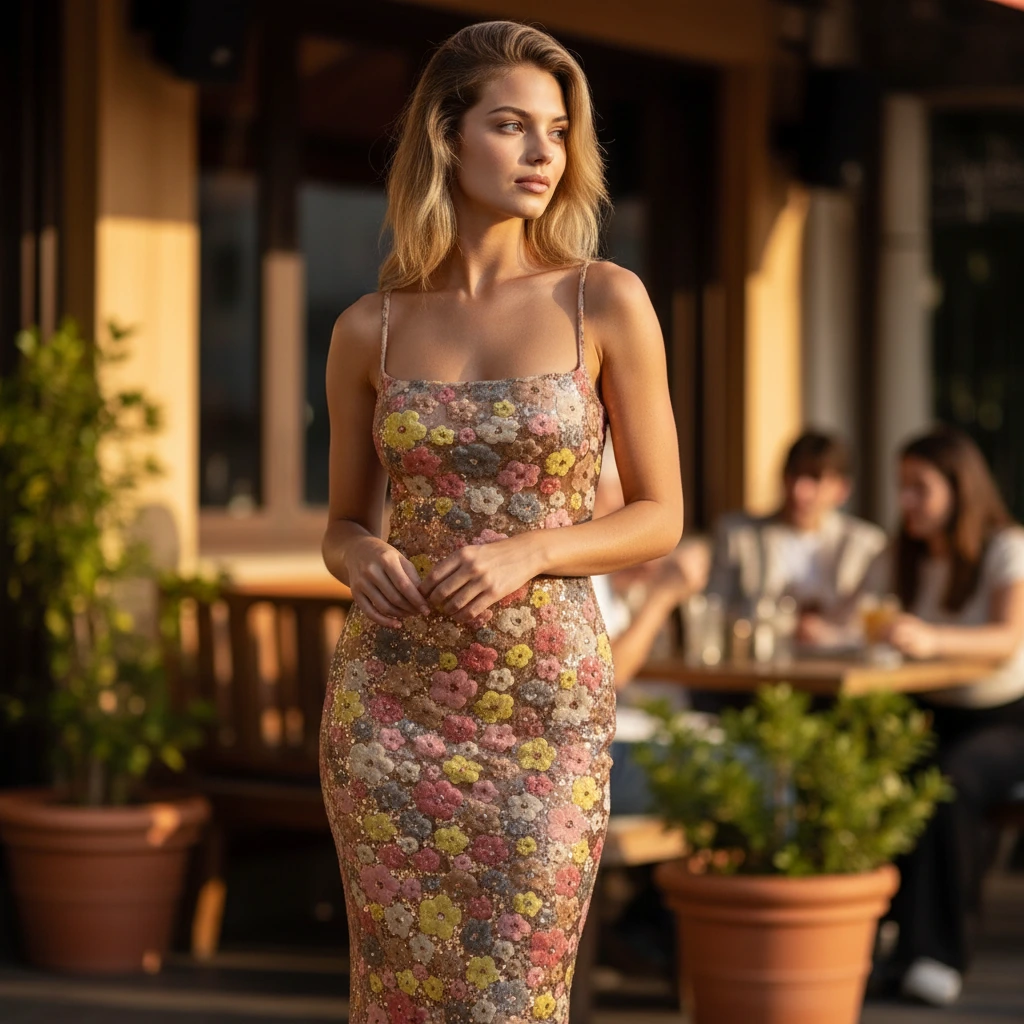 Designed to captivate with every step, this elegant maxi gown features a sleek, figure-skimming silhouette enhanced by intricate floral embellishments. The delicate straps and refined neckline create a balanced, feminine look with unmistakable evening appeal. Ideal for formal dinners, celebrations, and special night outings, this gown delivers timeless sophistication with effortless confidence.