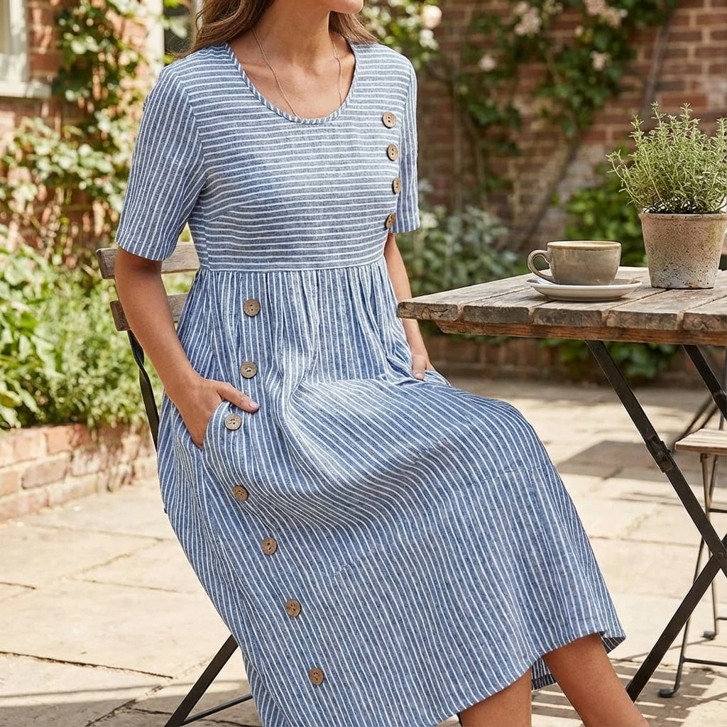 This midi dress is designed for effortless everyday wear with a relaxed, easygoing feel. The loose silhouette offers a flattering drape that moves comfortably with you, making it ideal for warm days and casual outings. Finished with subtle button details and practical pockets, it blends timeless style with laid-back functionality.