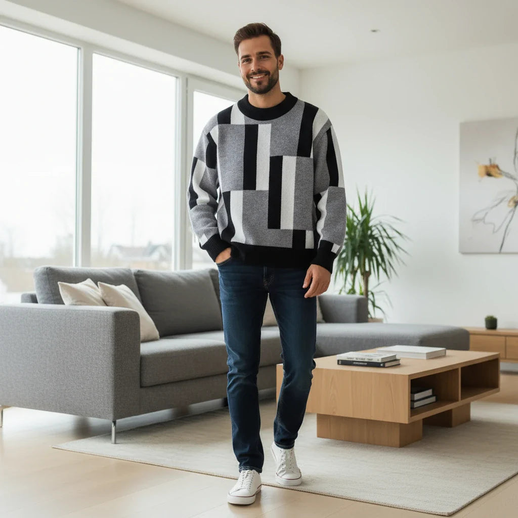 The Colorblock Geometric Knit Sweater blends modern artistry with timeless comfort. Featuring bold rectangular panels in cool, contrasting tones, it delivers a clean, structured aesthetic perfect for everyday wear. The ribbed cuffs, hem, and neckline provide shape retention and warmth, while the soft knit ensures an easy fit. A statement piece that pairs effortlessly with jeans or chinos for casual sophistication.